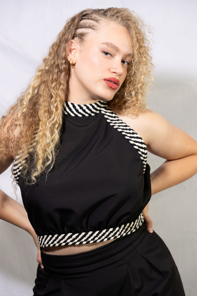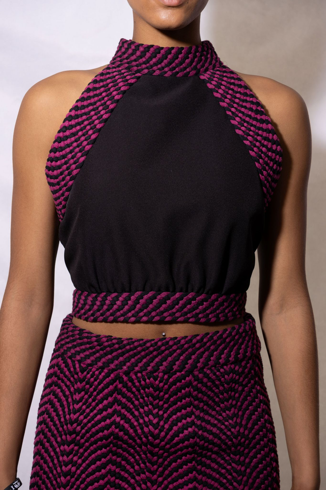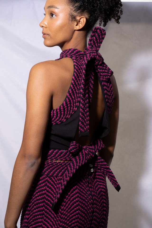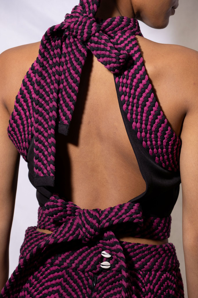 Ce haut allie audace et fonctionnalité grâce à son dos nu intégral, qui contraste avec une devanture structurée en softshell. Le laçage ajustable au niveau du cou et de la taille est réalisé via un tressage artisanal en fil de coton recyclé, ajoutant une texture unique et éthique. La coupe épouse le buste tout en libérant le dos, créant un équilibre entre tenue ajustée et liberté de mouvement