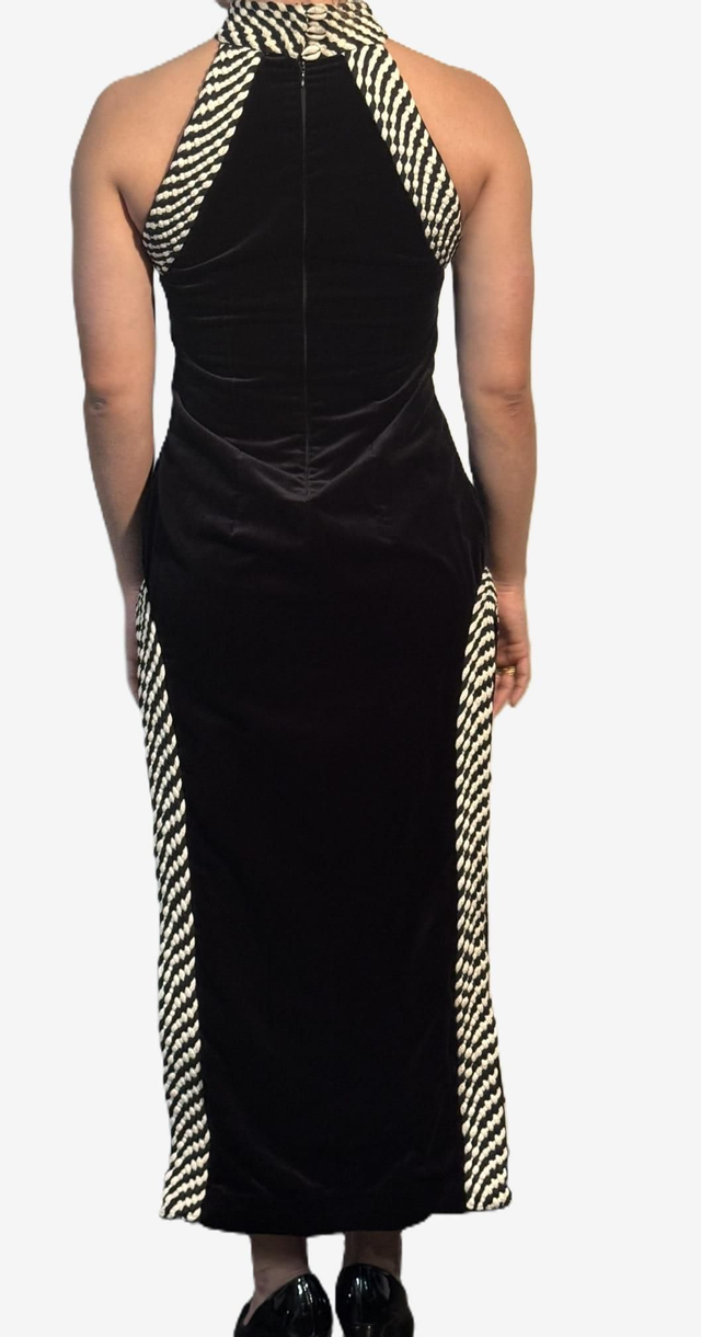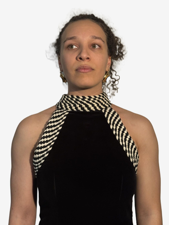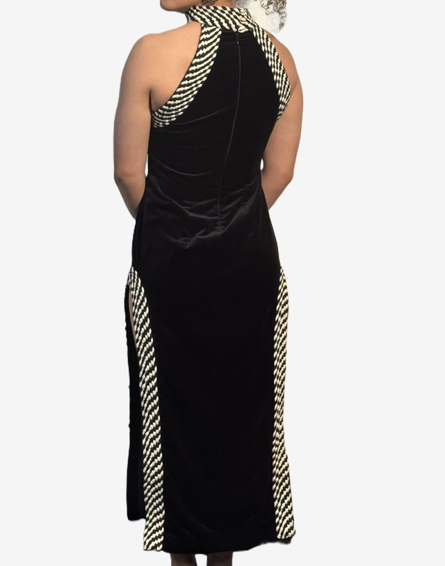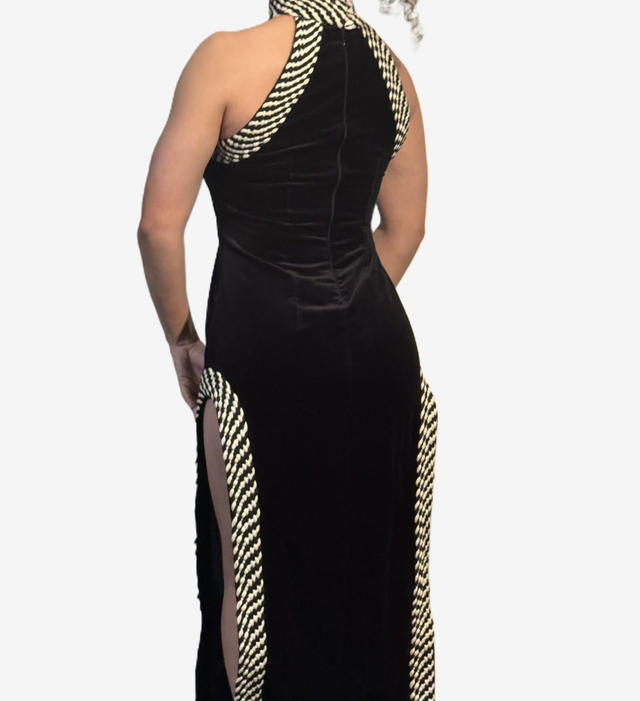 Une robe d’exception, taillée dans un velours noble au tombé fluide et à la touche douce et profonde. Le mariage du velours somptueux et du tressage détaillé en fait une pièce unique, aussi précieuse qu’une œuvre d’art. La robe épouse le buste et la taille avant de s’évaser légèrement en une jupe droite et fluide. La fermeture est dissimulée dans le dos. L’intérieur est entièrement doublé d’une viscose, assurant un confort absolu et un glissement parfait. La pièce maîtresse de cette robe est un magnifique travail de tressage. Ce tressage délicat mais structuré épouse parfaitement la forme du col montant et descend en encadrement sur les épaules, apportant une élégance architecturale et un raffinement remarquable. Du bas de la robe jusqu’à mi-cuisse, deux fentes sensuelles s’ouvrent sur chaque côté. Chacune est soigneusement bordée du même motif de tressage que le col et les épaules, créant une harmonie parfaite et un mouvement gracieux à chaque pas.
